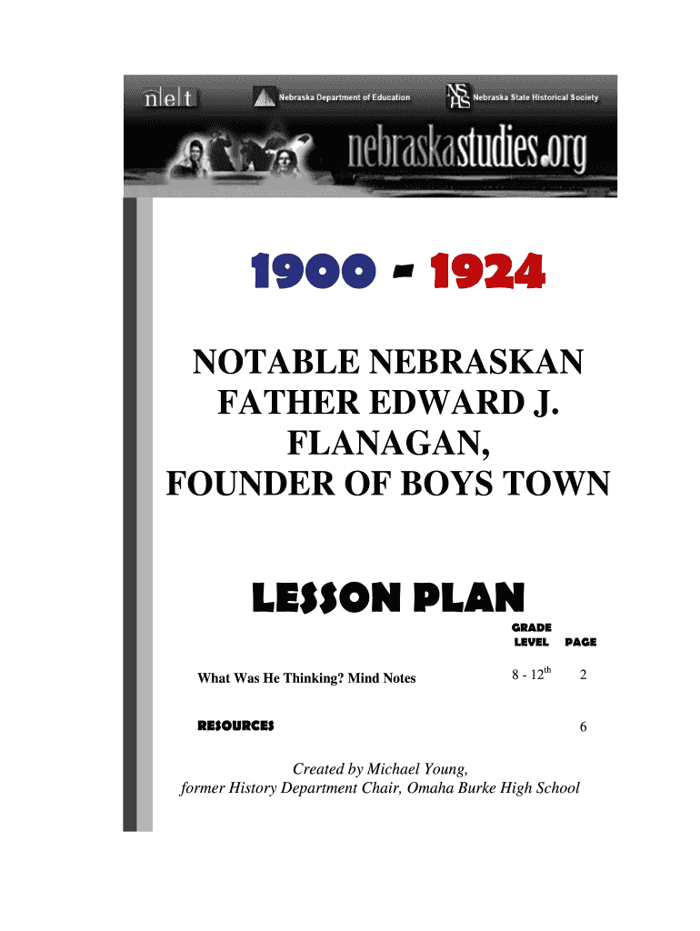 1900 1924 NOTABLE NEBRASKAN FATHER EDWARD J. FLANAGAN, FOUNDER OF BOYS TOWN LESSON PLAN GRADE LEVEL What Was He Thinking? Mind Notes PAGE 8 12th 2 RESOURCES Created by Michael Young, former History