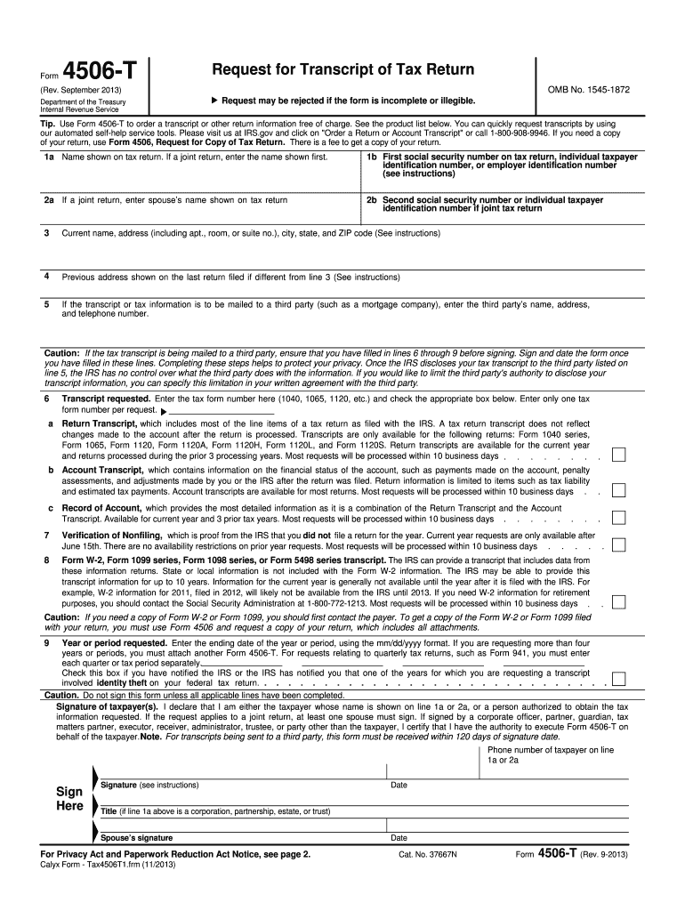 Form 4506T Request for Transcript of Tax Return OMB No. 15451872 (Rev. September 2013) Department of the Treasury Internal Revenue Service Request may be rejected if the form is incomplete or illegible.