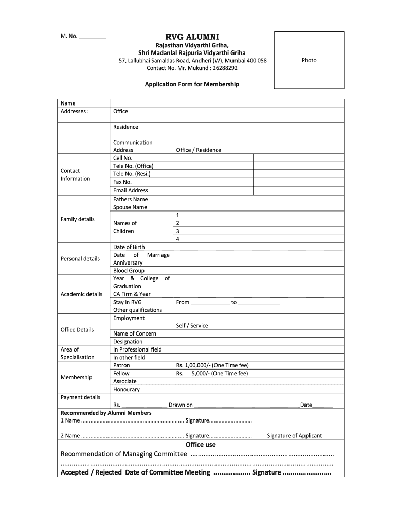 RPG ALUMNI M. No. Photo Rajasthan Vidyarthi Grid, Sari Manual Rasputin Vidyarthi Grid 57, Lallubhai Samples Road, Adhere (W), Mumbai 400 058 Contact No. Mr. Mound : 26288292 Application Form for Membership