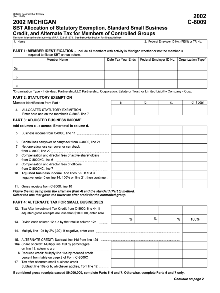 Reset Form 2002 C8009 Michigan Department of Treasury (Rev. 1202) 2002 MICHIGAN SBT Allocation of Statutory Exemption, Standard Small Business Credit, and Alternate Tax for Members of Controlled Groups