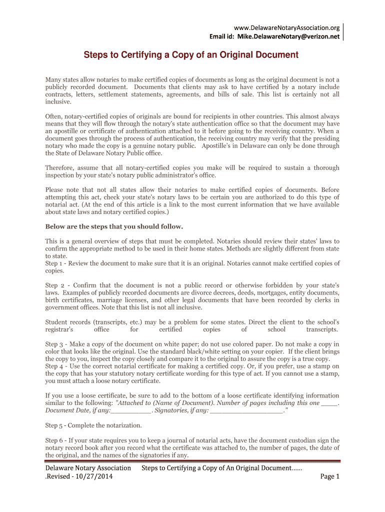 WWW.DelawareNotaryAssociation.org Email ID: Mike. DelawareNotary Verizon.net Steps to Certifying a Copy of an Original Document Many states allow notaries to make certified copies of documents as