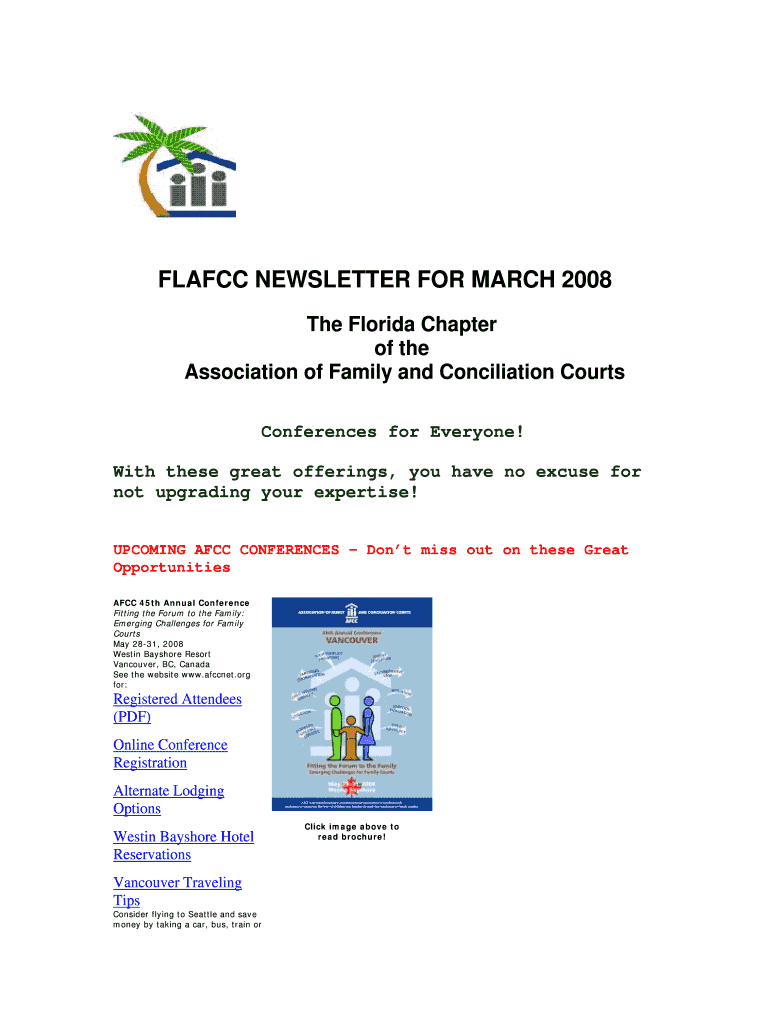 FLA FCC NEWSLETTER FOR MARCH 2008 The Florida Chapter of the Association of Family and Conciliation Courts Conferences for Everyone! With these great offerings, you have no excuse for not upgrading