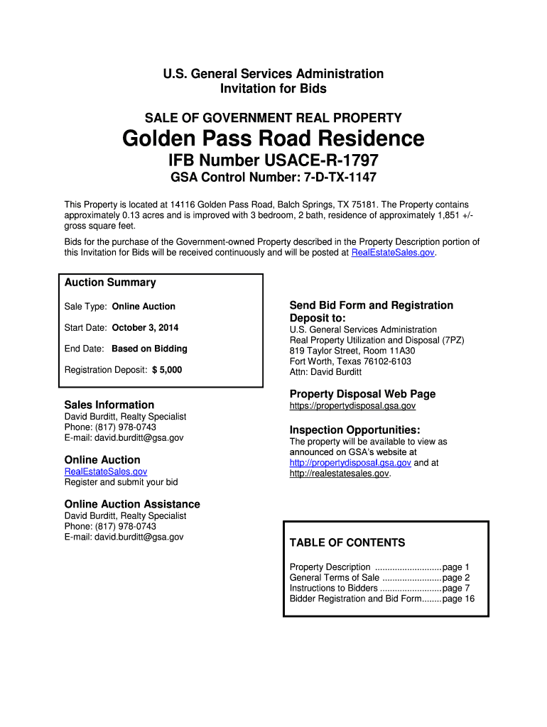 U.S. General Services Administration Invitation for Bids SALE OF GOVERNMENT REAL PROPERTY Golden Pass Road Residence IF Number USACER1797 GSA Control Number: 7DTX1147 This Property is located at 14116