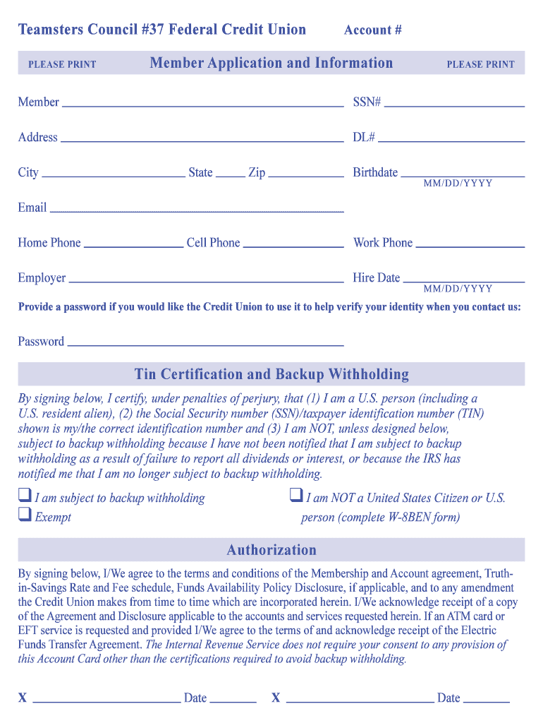Teamsters Council #37 Federal Credit Union PLEASE PRINT Account # Member Application and Information Member SSN# Address PLEASE PRINT DL# City State Zip Birthdate M /D /Y Y Y Y Email Home Phone Cell