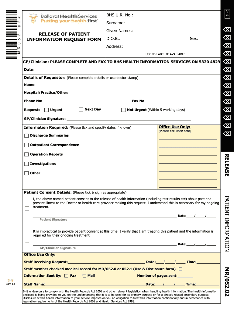 Get the free BHS UR No Surname RELEASE OF PATIENT INFORMATION - gp bhs org