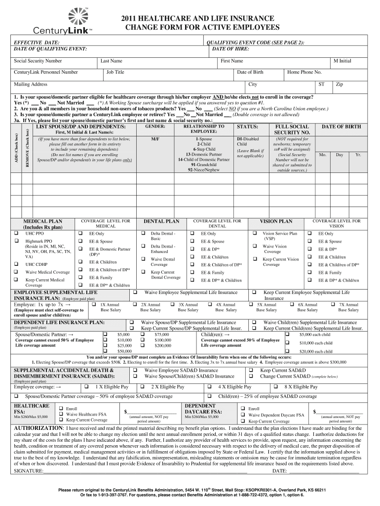 The CenturyLink Healthcare and Life Insurance Change Form is a benefits enrollment document used by employees to update their healthcare and life insurance coverage options.
