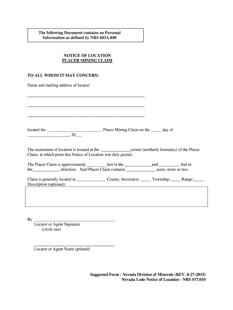 The following Document contains no Personal Information as defined by NRS 603A.040 NOTICE OF LOCATION PLACER MINING CLAIM TO ALL WHOM IT MAY CONCERN: Name and mailing address of locator: located the