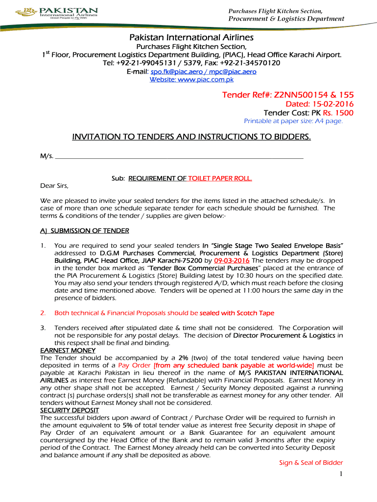 Purchases Flight Kitchen Section, Procurement & Logistics Department Pakistan International Airlines Purchases Flight Kitchen Section, 1st Floor, Procurement Logistics Department Building, (PAC),
