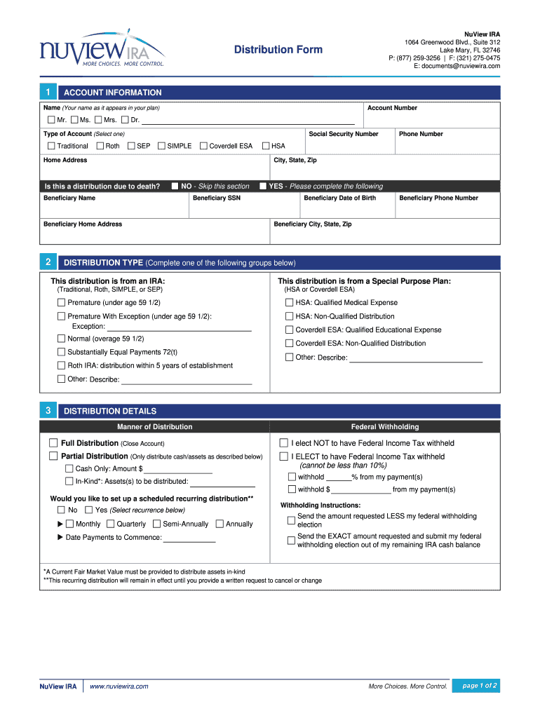 Print Form View IRA 1064 Greenwood Blvd., Suite 312 Lake Mary, FL 32746 P: (877) 2593256 F: (321) 2750475 E: documents nuviewira.com Distribution Form 1 ACCOUNT INFORMATION Name (Your name as it appears
