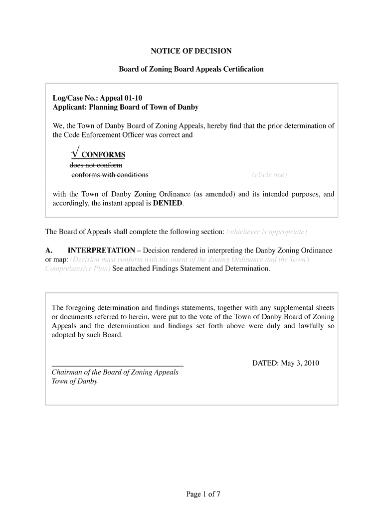 Get the free NOTICE OF DECISION Board of Zoning Board Appeals - townofdanbyny