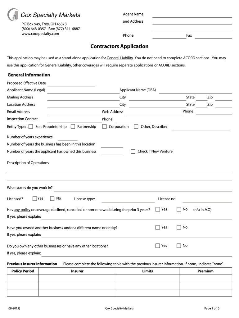 The Contractors Application is a business form used by contractors to apply for general liability insurance.