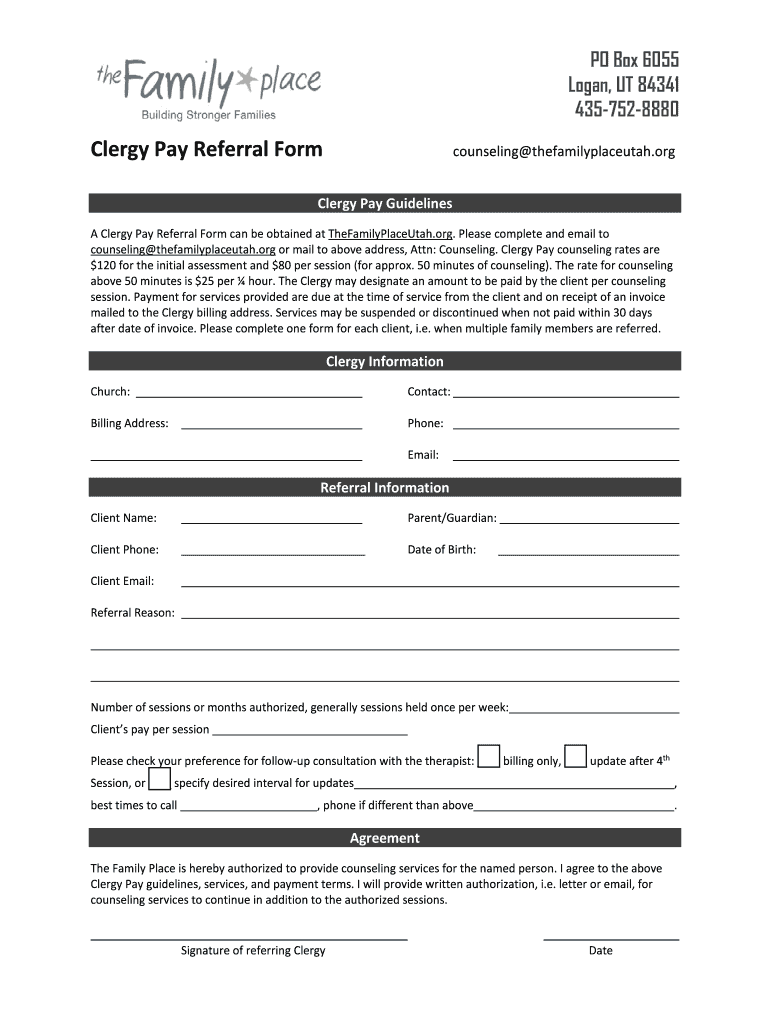 Get the free Clergy Pay Referral Form counselingthefamilyplaceutah