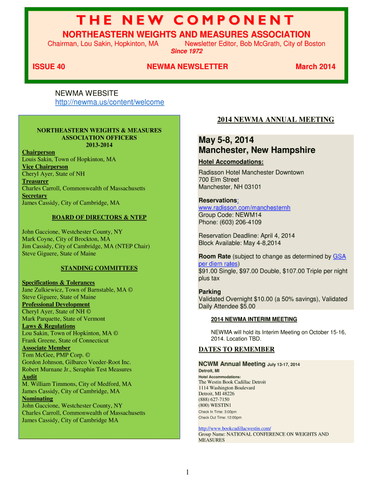 THE NEW COMPONENT NORTHEASTERN WEIGHTS AND MEASURES ASSOCIATION Chairman, Lou Skin, Opinion, MA Newsletter Editor, Bob McGrath, City of Boston Since 1972 ISSUE 40 NEWMAN NEWSLETTER March 2014 NEWMAN