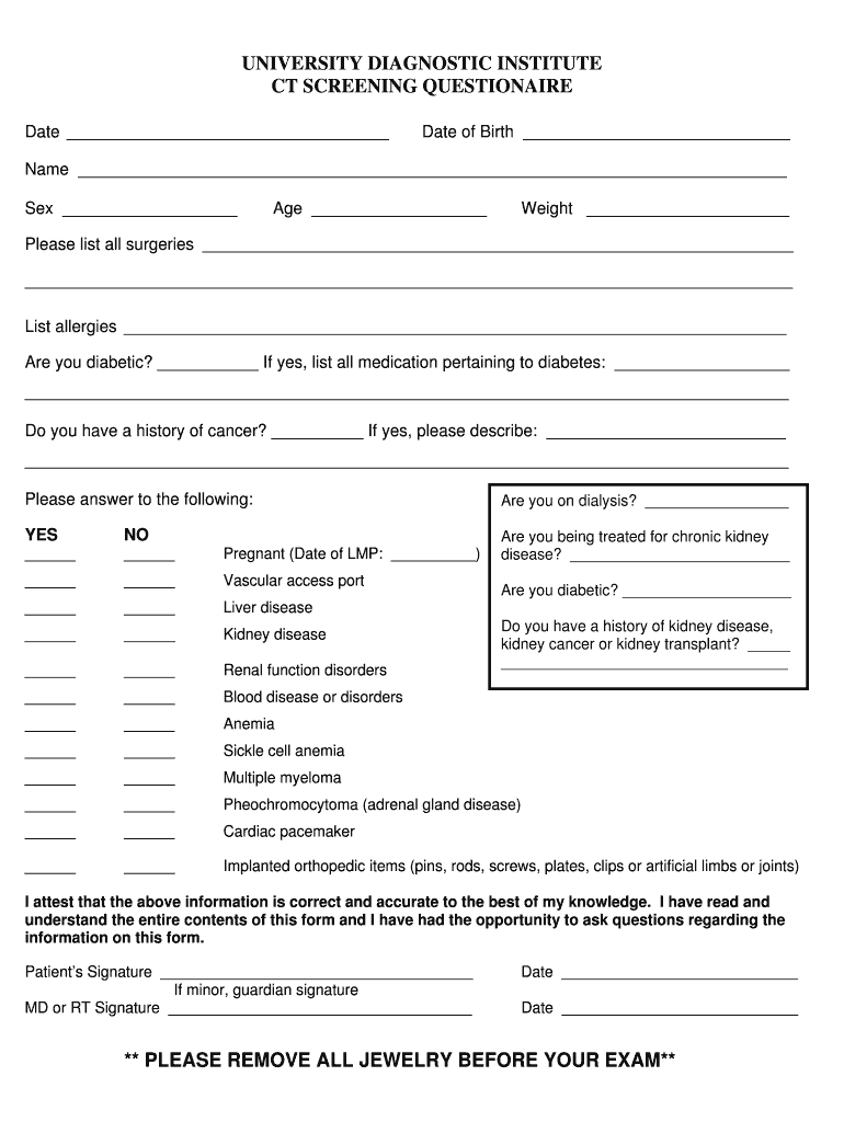 UNIVERSITY DIAGNOSTIC INSTITUTE CT SCREENING QUESTIONNAIRE Date of Birth Name Sex Age Weight Please list all surgeries List allergies Are you diabetic? If yes, list all medication pertaining to diabetes: