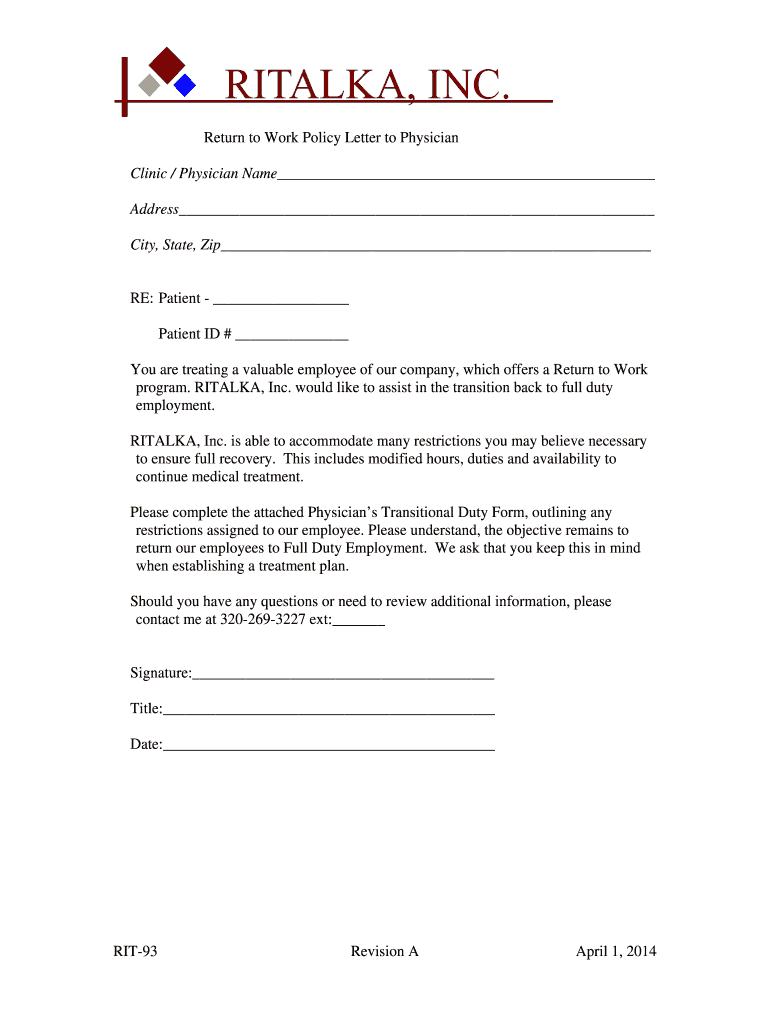 Return to Work Policy Letter to Physician Clinic / Physician Name Address City, State, Zip RE: Patient ID # You are treating a valuable employee of our company, which offers a Return to Work program.