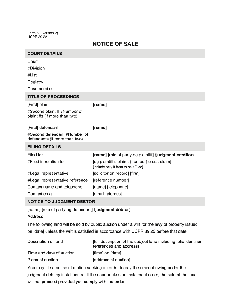Form 68 (version 2) CPR 39.22 NOTICE OF SALE COURT DETAILS Court #Division #List Registry Case number TITLE OF PROCEEDINGS First plaintiff name #Second plaintiff #Number of plaintiffs (if more than