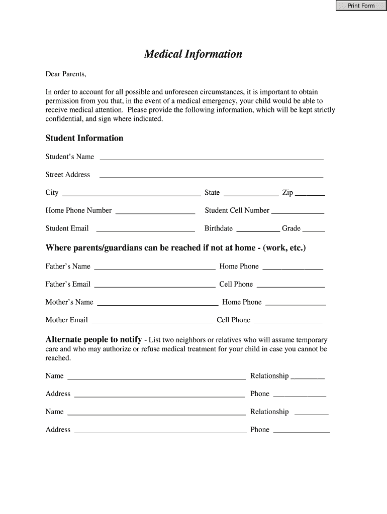 Print Form Medical Information Dear Parents, In order to account for all possible and unforeseen circumstances, it is important to obtain permission from you that, in the event of a medical emergency,