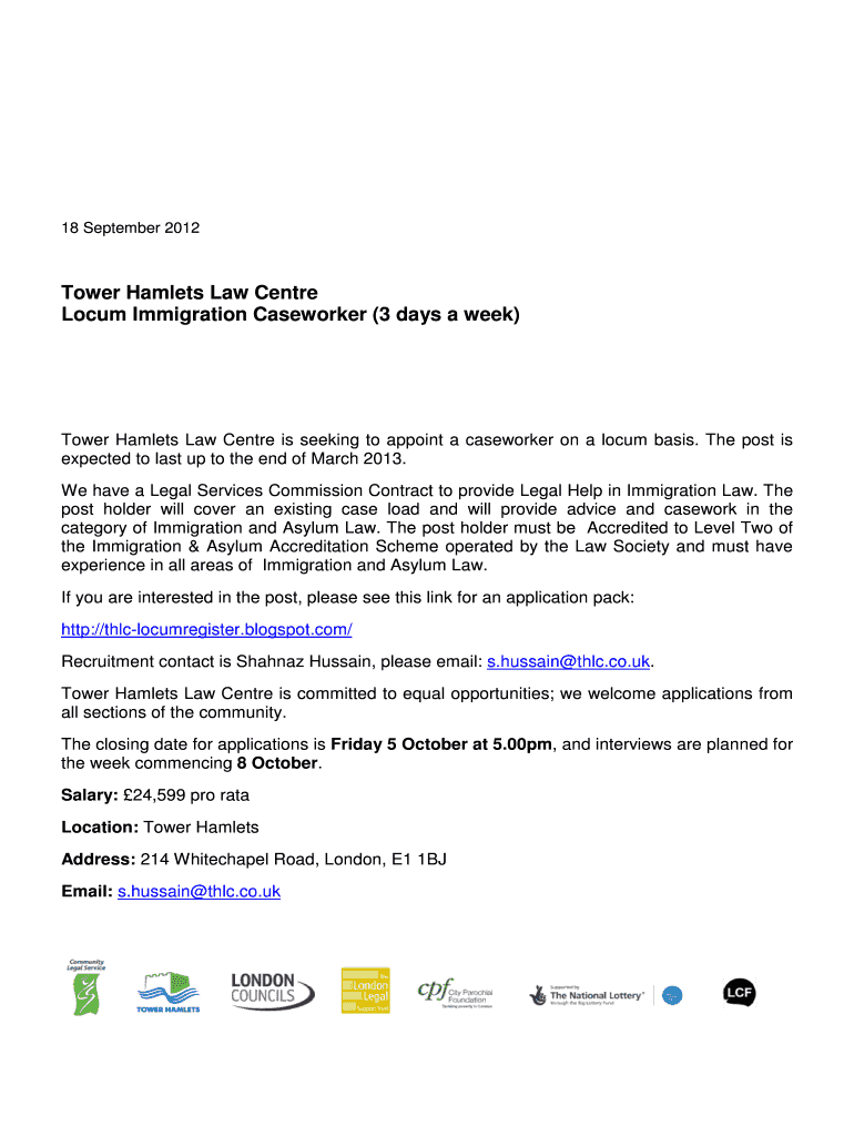 18 September 2012 Tower Hamlets Law Center Locum Immigration Caseworker (3 days a week) Tower Hamlets Law Center is seeking to appoint a caseworker on a locum basis. The post is expected to last up