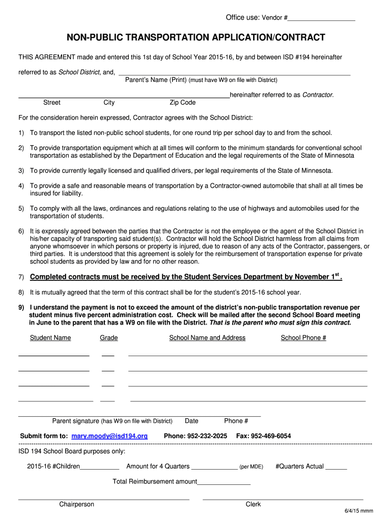 Office use: Vendor # NONPUBLIC TRANSPORTATION APPLICATION/CONTRACT THIS AGREEMENT made and entered this 1st day of School Year 201516, by and between ISD #194 hereinafter referred to as School District,
