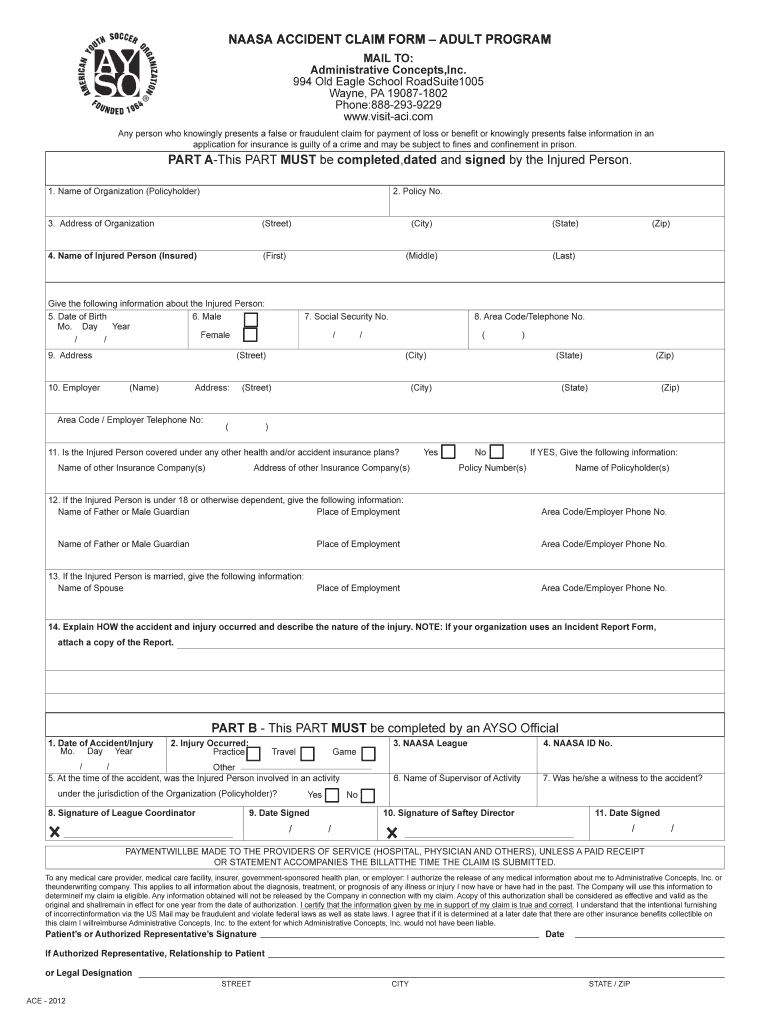 CLAIM INSTRUCTIONS NASA Soccer Accident Insurance (NSA) These Instructions are to be used for completing the NSA CLAIM FORM for injuries STARTING July 1, 2012! **Note: The claim form AS FOLLOWS should