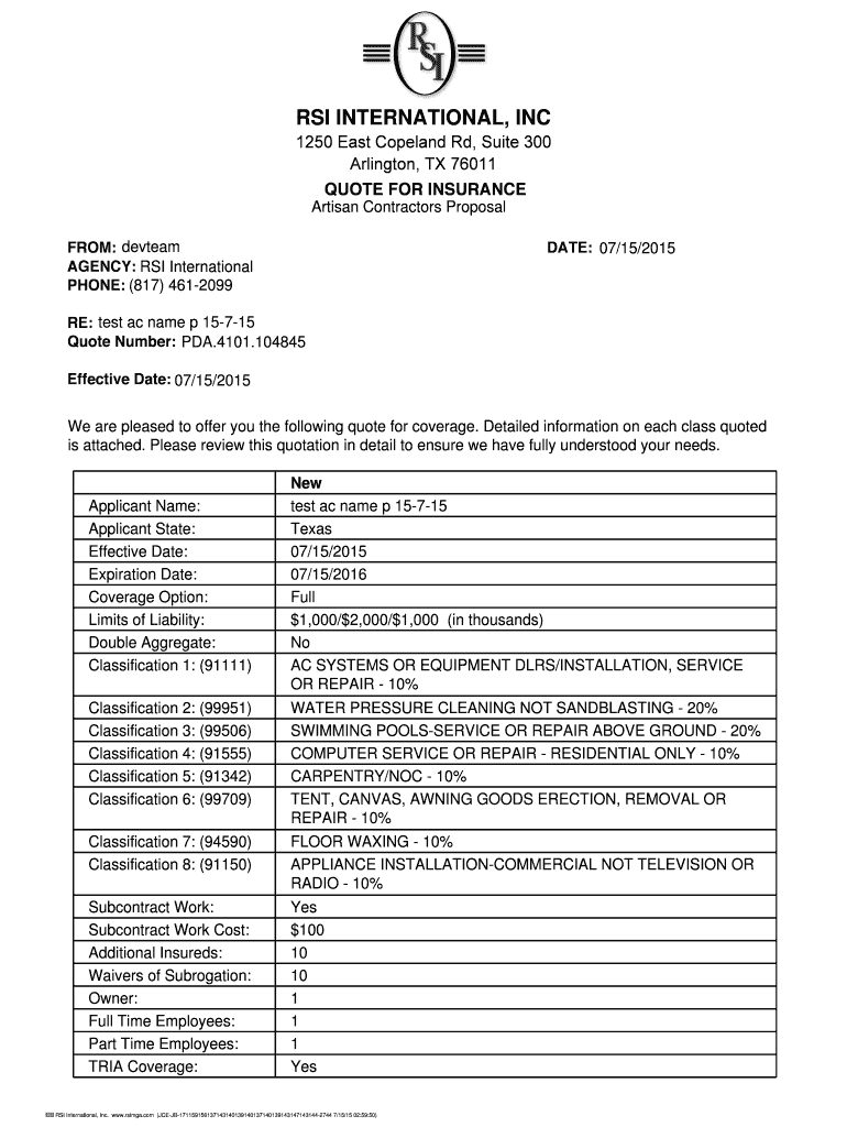 RSI INTERNATIONAL, INC 1250 East Copeland Rd, Suite 300 Arlington, TX 76011 QUOTE FOR INSURANCE Artisan Contractors Proposal FROM: team AGENCY: RSI International PHONE: (817) 4612099 DATE: 07/15/2015