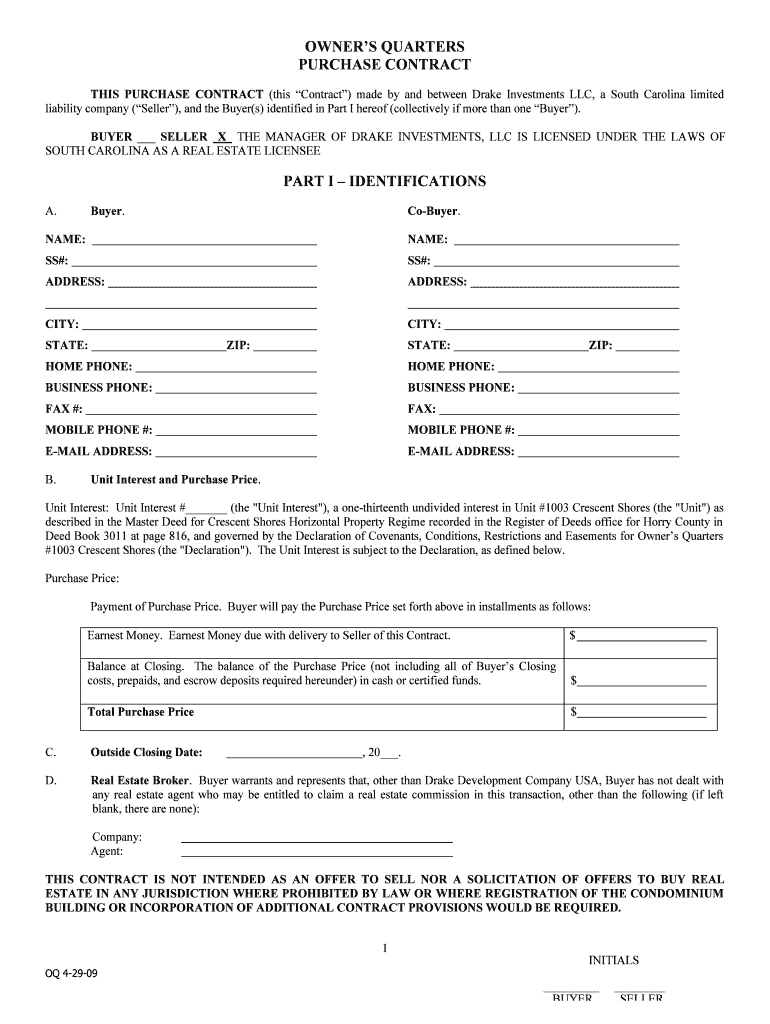OWNERS QUARTERS PURCHASE CONTRACT THIS PURCHASE CONTRACT (this Contract) made by and between Drake Investments LLC, a South Carolina limited liability company (Seller), and the Buyer(s) identified