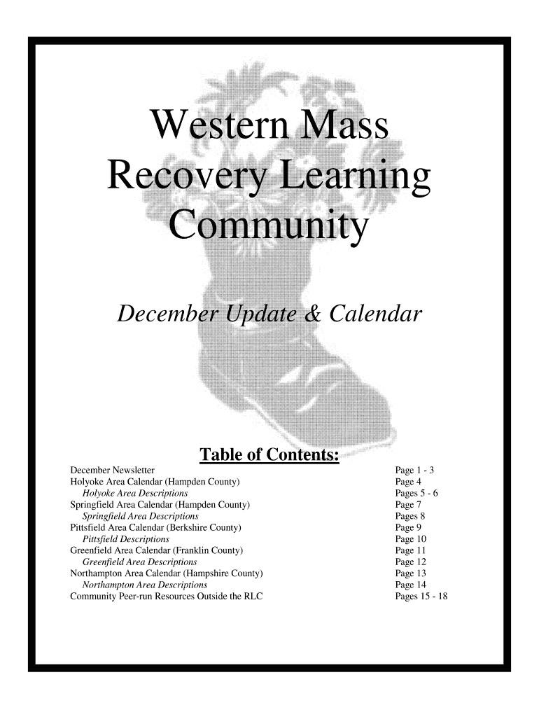 Western Mass Recovery Learning Community December Update & Calendar Table of Contents: December Newsletter Holyoke Area Calendar (Hampden County) Holyoke Area Descriptions Springfield Area Calendar