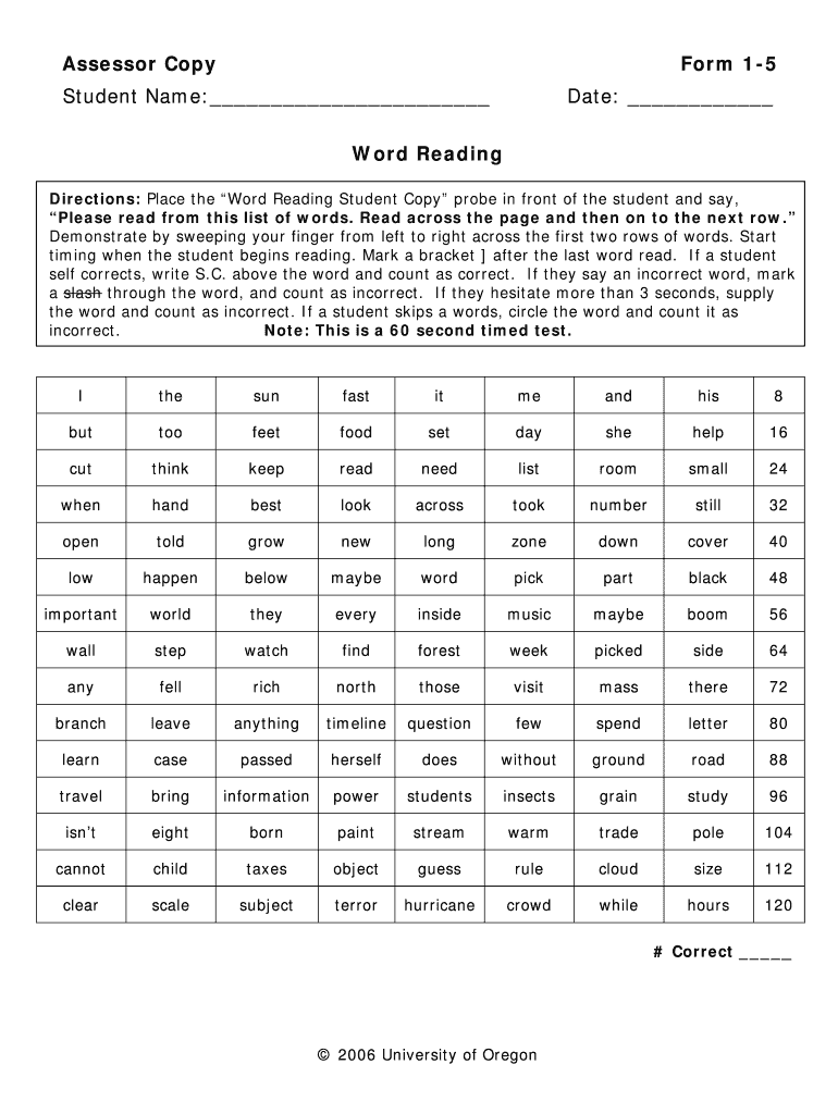 Assessor Copy Form 15 Student Name: Date: Word Reading Directions: Place the Word Reading Student Copy probe in front of the student and say, Please read from this list of words. Read across the page