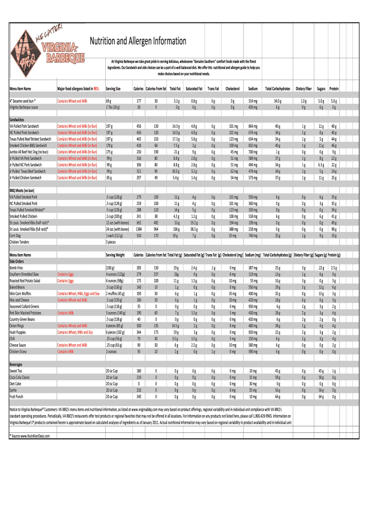 Nutrition and Allergen Information At Virginia Barbecue we take great pride in serving delicious, wholesome “Genuine Southern comfort foods made with the finest ingredients. Our Sandwich and side