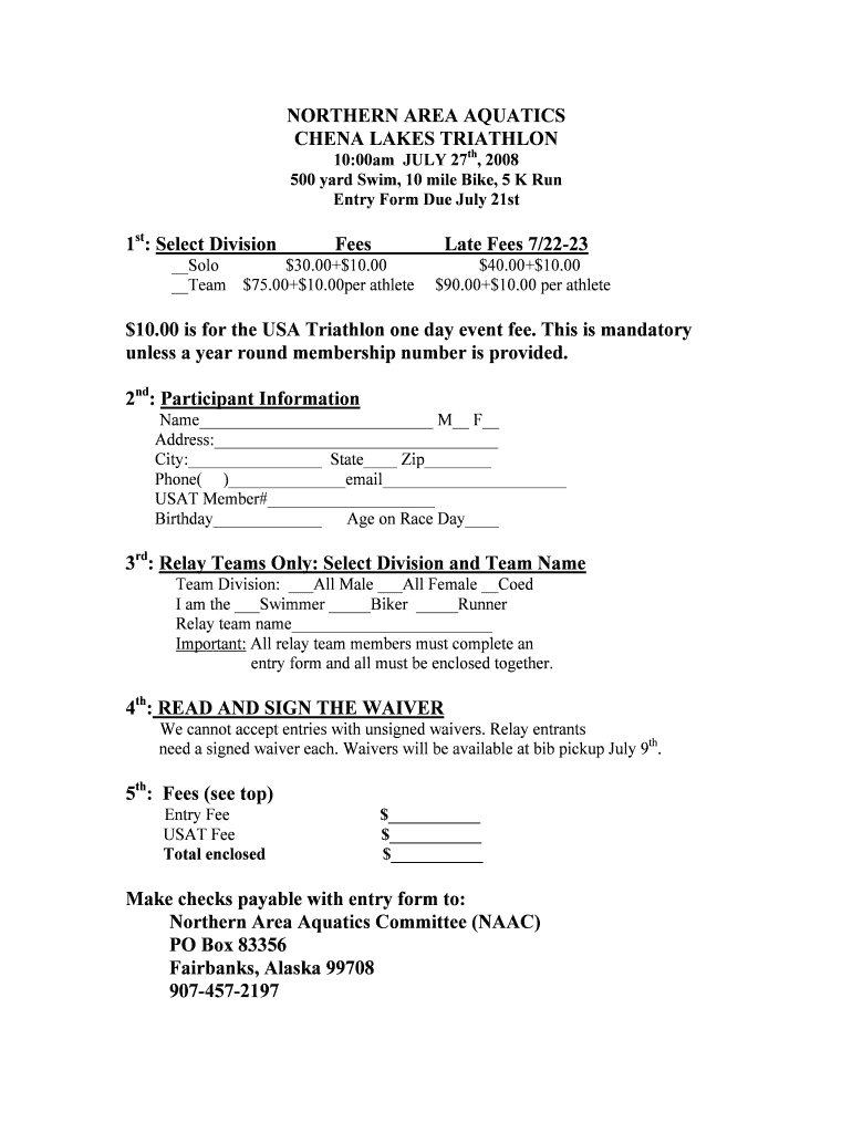NORTHERN AREA AQUATICS CHINA LAKES TRIATHLON 10:00am JULY 27th, 2008 500-yard Swims, 10 mile Bikes, 5 K Run Entry Form Due July 21st 1st: Select Division Fees Late Fees 7/2223 Solo $30.00+$10.00 Team