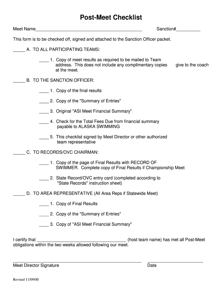 Postmen Checklist Meet Name Sanction# This form is to be checked off, signed and attached to the Sanction Officer packet. A. TO ALL PARTICIPATING TEAMS: 1. Copy of meet results as required to be mailed