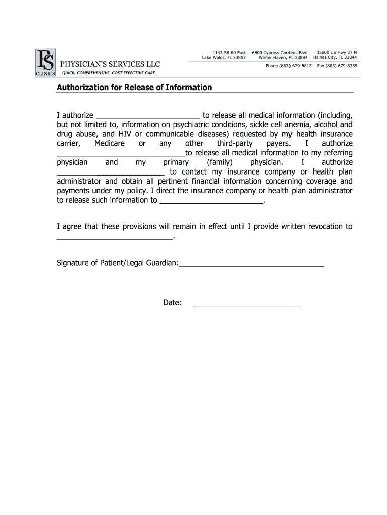 Authorization for Release of Information I authorize to release all medical information (including, but not limited to, information on psychiatric conditions, sickle cell anemia, alcohol and drug
