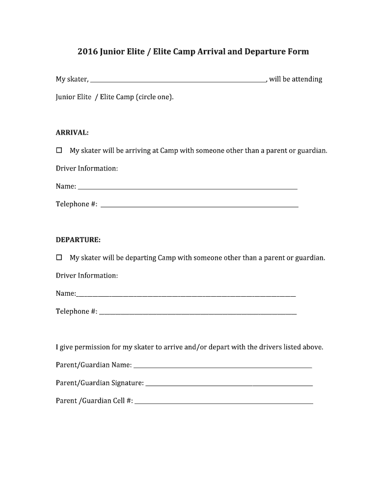2016 Junior Elite / Elite Camp Arrival and Departure Form My skater, will be attending Junior Elite / Elite Camp (circle one). ARRIVAL: o My skater will be arriving at Camp with someone other than