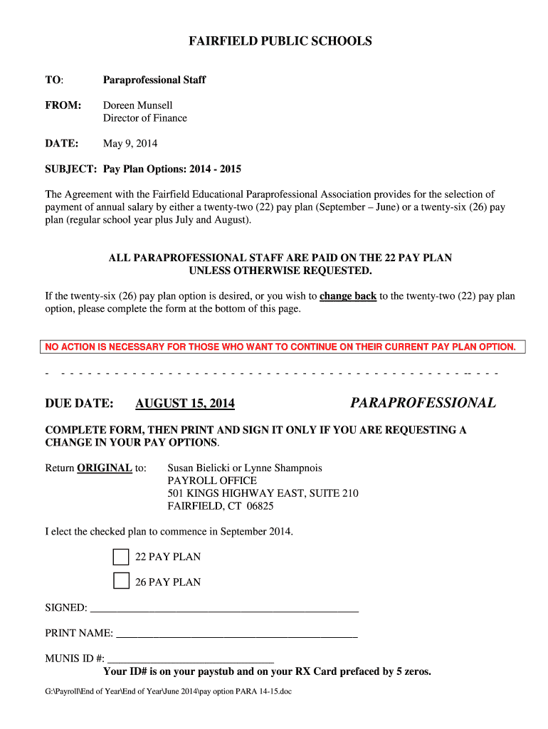 FAIRFIELD PUBLIC SCHOOLS TO: Paraprofessional Staff FROM: Doreen Mun sell Director of Finance DATE: May 9, 2014, SUBJECT: Pay Plan Options: 2014 2015 The Agreement with the Fairfield Educational Paraprofessional