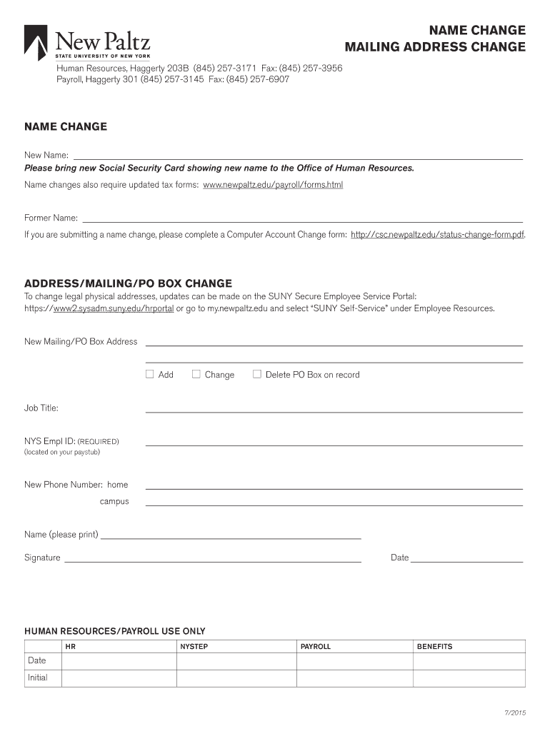 NAME CHANGE MAILING ADDRESS CHANGE S TAT E U N I V E R S I T Y O F N E W Y O R K Human Resources, Haggerty 203B (845) 2573171 Fax: (845) 2573956 Payroll, Haggerty 301 (845) 2573145 Fax: (845) 2576907