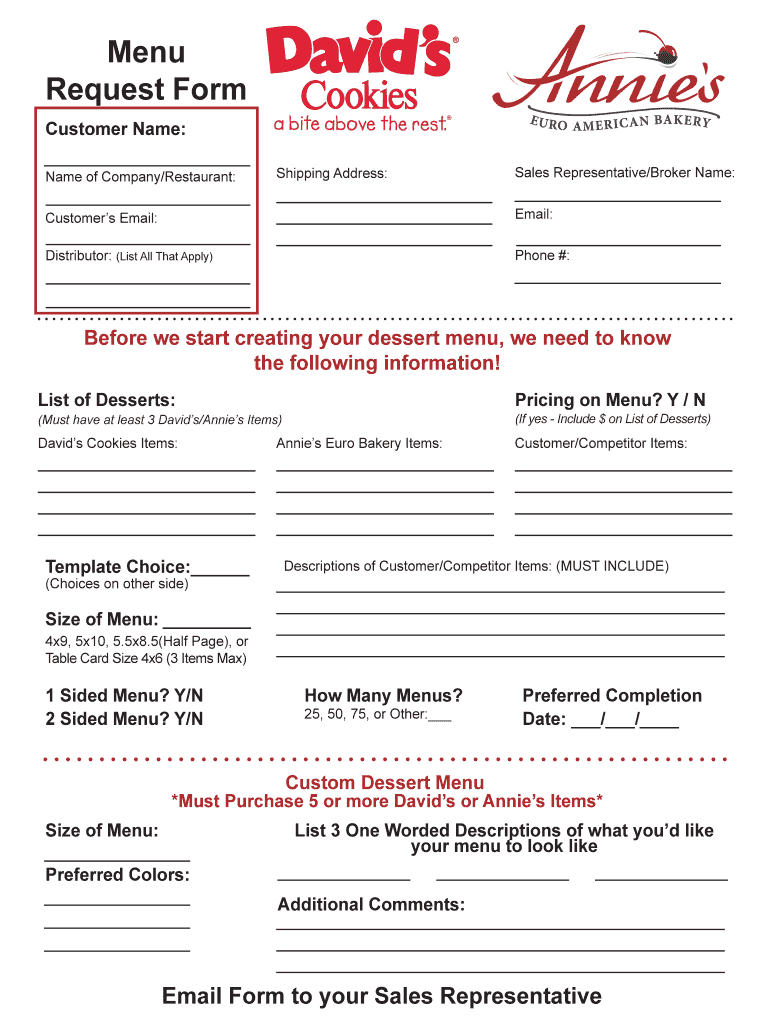 Menu Request Form Customer Name: Name of Company/Restaurant: Shipping Address: Sales Representative/Broker Name: Customers Email: Email: Distributor: (List All That Apply) Phone #: Before we start