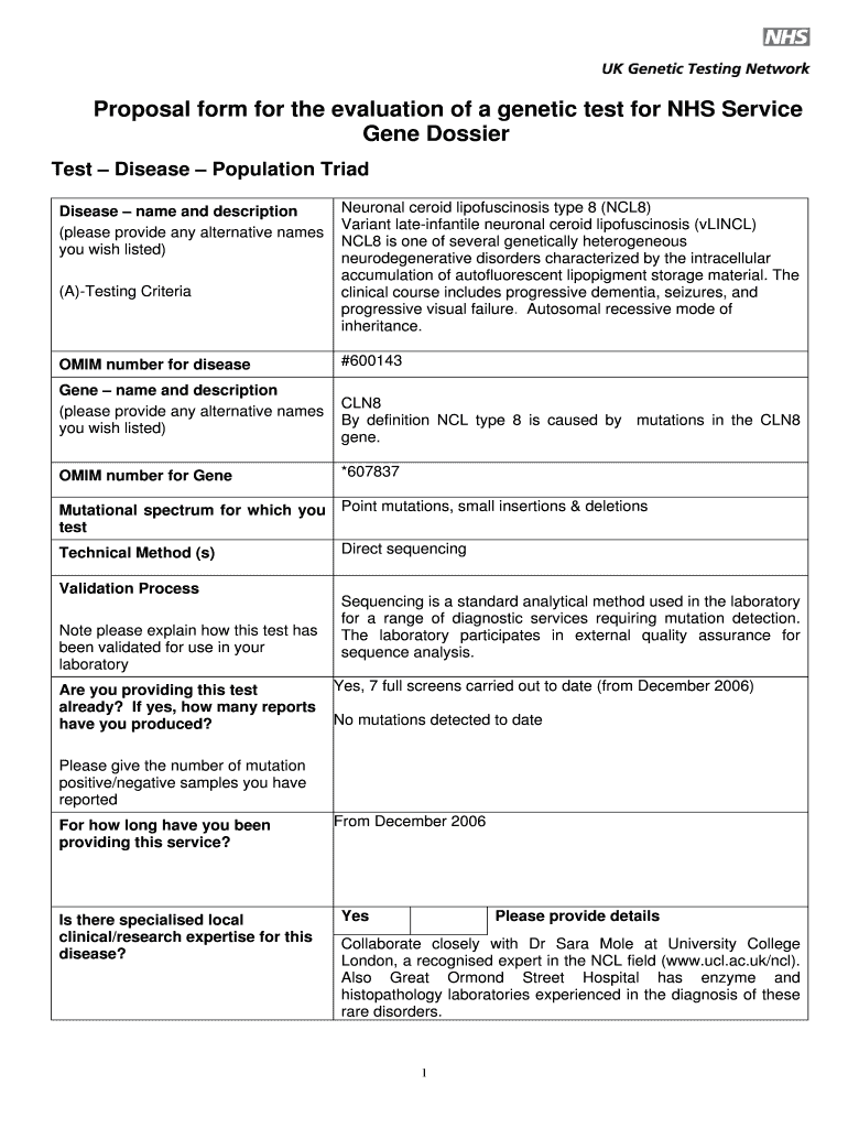 Proposal form for the evaluation of a genetic test for NHS Service Gene Dossier Test Disease Population Triad Disease name and description (please provide any alternative names you wish listed) (A)Testing