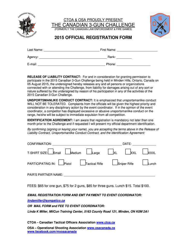 CTA & OSA PROUDLY PRESENT THE CANADIAN 3GUN CHALLENGE (FORMERLY THE CANADIAN LAW ENFORCEMENT & FIRE GAMES) 2015 OFFICIAL REGISTRATION FORM Last Name: First Name: Agency: Rank: Email: Phone: RELEASE
