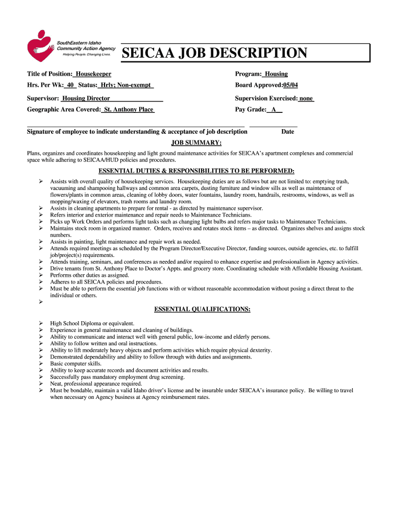 Get the free Title of Position Housekeeper - seicaa