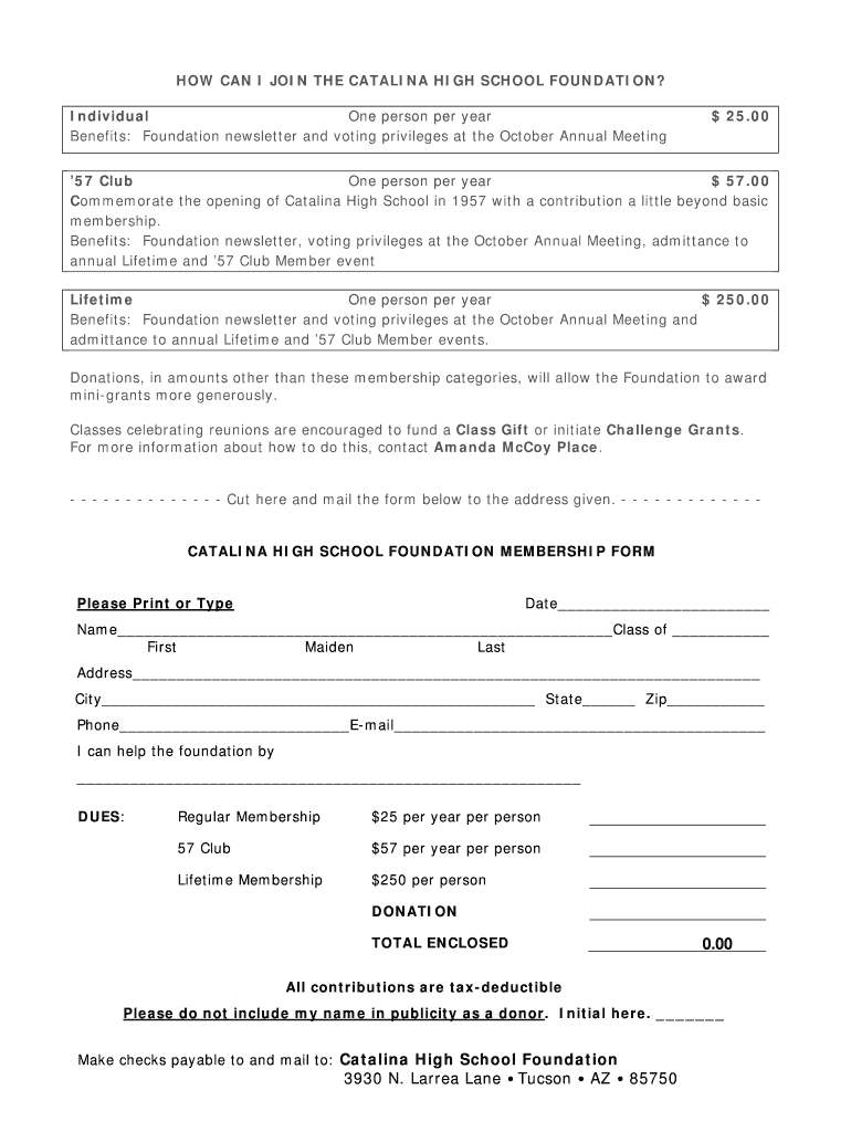 HOW CAN I JOIN THE CATALINA HIGH SCHOOL FOUNDATION? Individual One person per year Benefits: Foundation newsletter and voting privileges at the October Annual Meeting $25.00 57 Club One person per