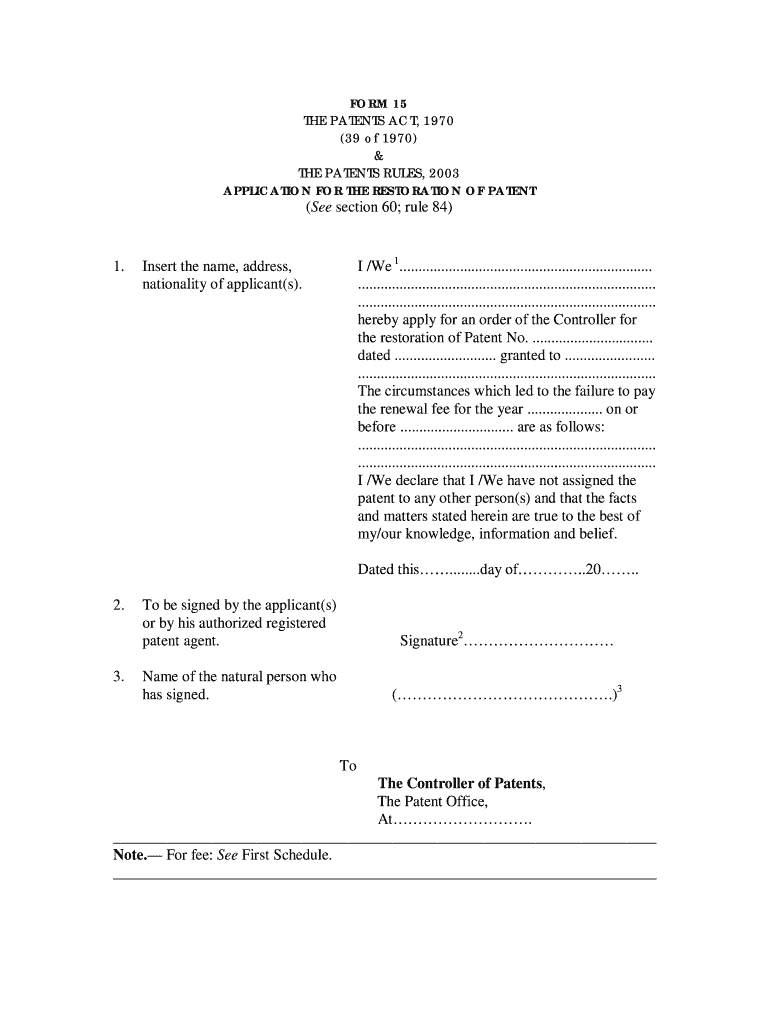 FORM 15 THE PATENTS ACT, 1970 (39 of 1970) & THE PATENTS RULES, 2003 APPLICATION FOR THE RESTORATION OF PATENT (See section 60; rule 84) 1. I /We 1...................................................................