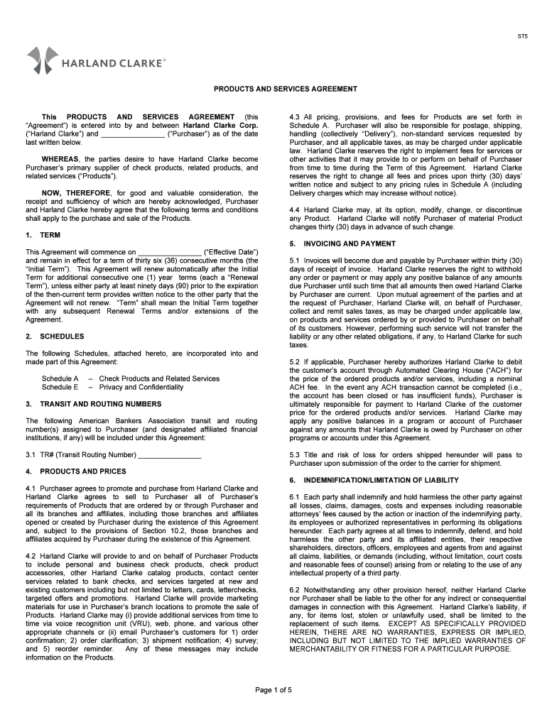 ST5 PRODUCTS AND SERVICES AGREEMENT These PRODUCTS AND SERVICES AGREEMENT (this Agreement) is entered into by and between Harland Clarke Corp. (Harland Clarke) and (Purchaser) as of the date last