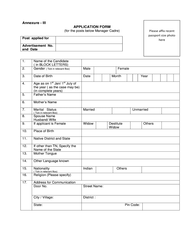 Appendix III APPLICATION FORM (for the posts below Manager Cadre) Please affix recent passport size photo here Post applied for Advertisement No. and Date 1. 2. Name of the Candidate (in BLOCK LETTERS)