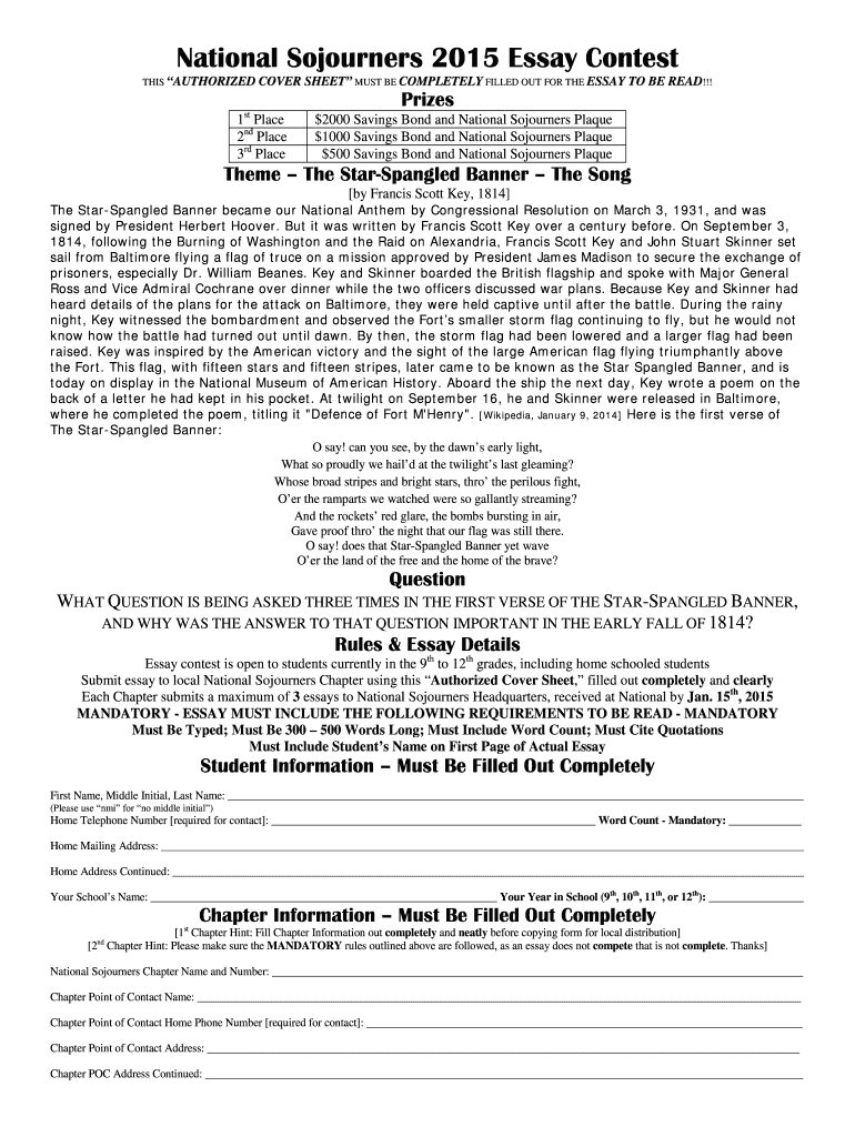 National Sojourners 2015 Essay Contest THIS AUTHORIZED COVER SHEET MUST BE COMPLETELY FILLED OUT FOR THE ESSAY TO BE READ!!! 1st Place 2nd Place 3rd Place Prizes $2000 Savings Bond and National Sojourners