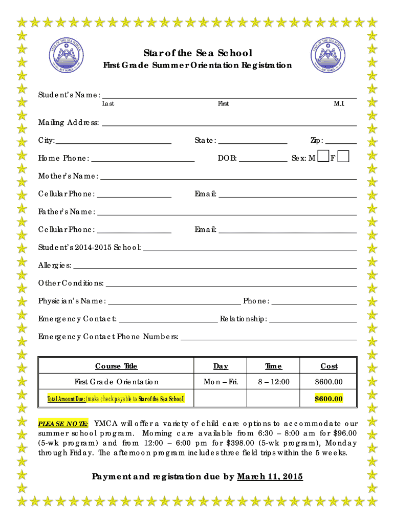 Star of the Sea School First Grade Summer Orientation Registration Students Name: Last First M.I. Mailing Address: City: State: Home Phone: Zip: DOB: Sex: M F Mothers Name: Cellular Phone: Email: