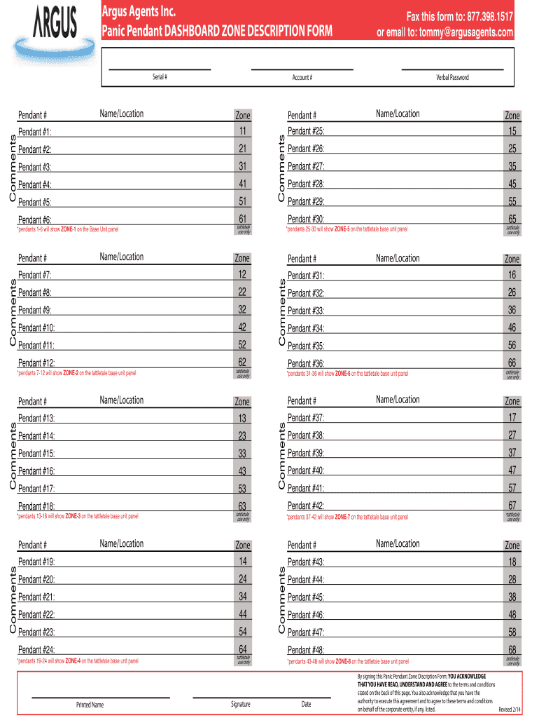 Argus Agents Inc. Panic Pendant DASHBOARD ZONE DESCRIPTION FORM Serial # Pendant #3: Pendant #4: Pendant #5: Pendant #6: *pendants 16 will show ZONE1 on the Base Unit panel Pendant # Name/Location