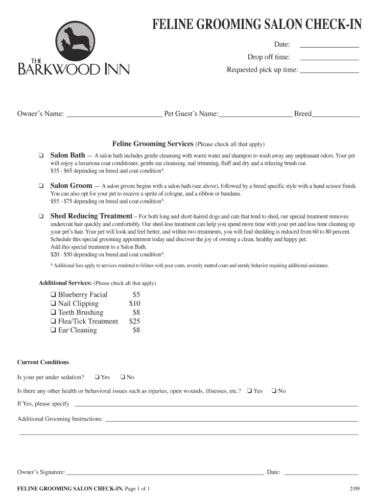 FELINE GROOMING SALON CHECKING Date: Drop off time: Requested pick up time: Owners Name: Pet Guests Name: Breed Feline Grooming Services (Please check all that apply) K Salon Bath A salon bath includes