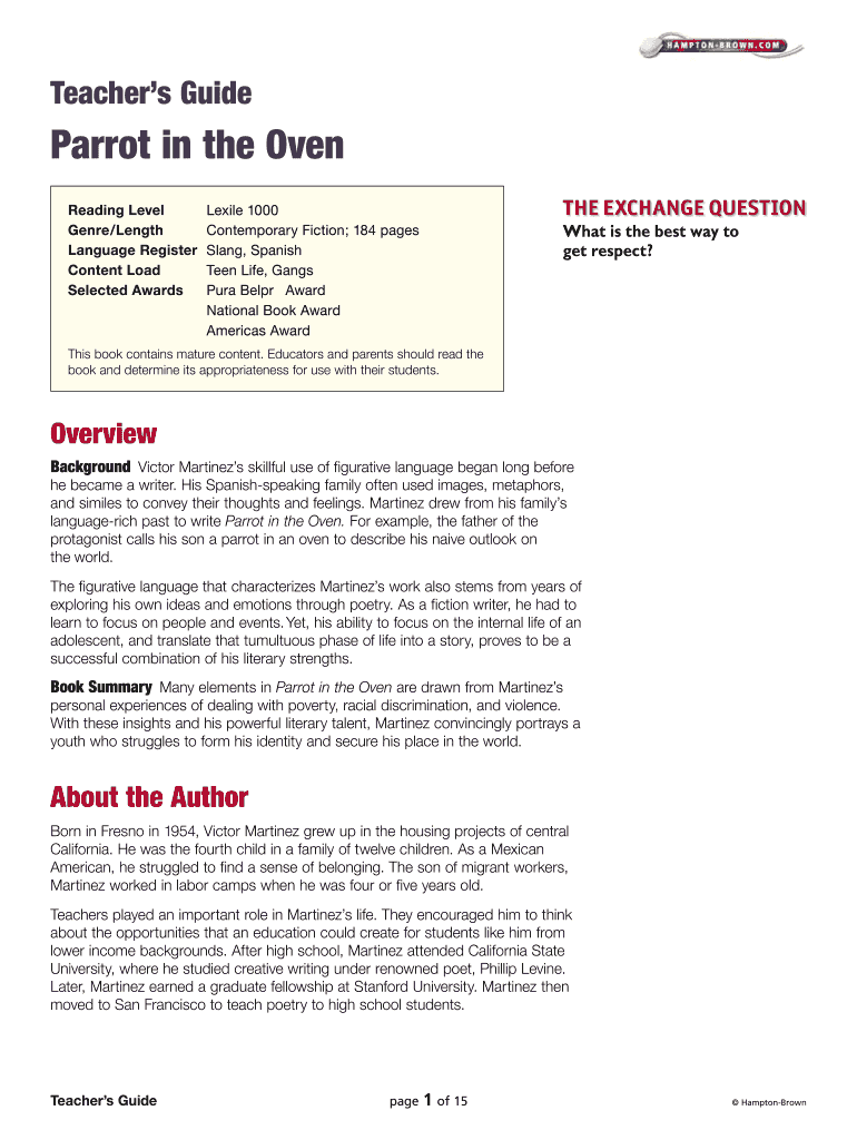 Teachers Guide Parrot in the Oven Reading Level Genre/Length Language Register Content Load Selected Awards THE EXCHANGE QUESTION Exile 1000 Contemporary Fiction; 184 pages Slang, Spanish Teen Life,