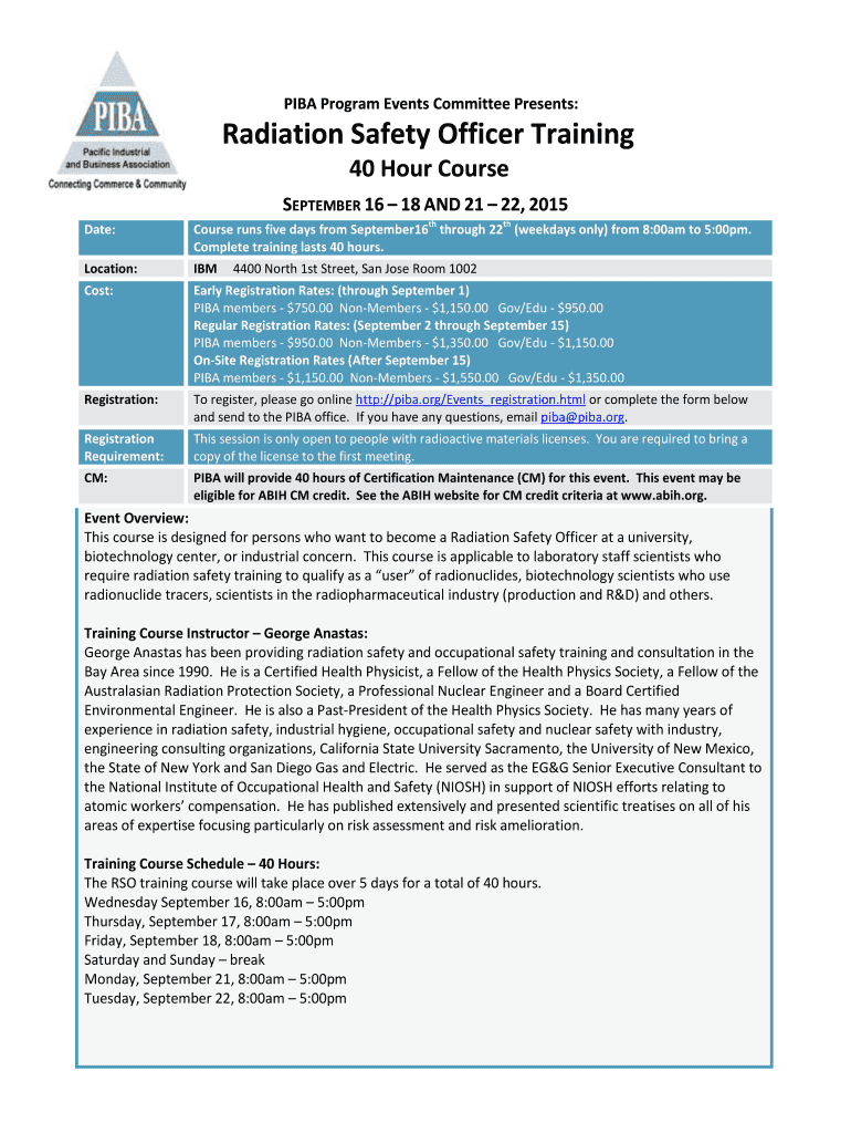 PBA Program Events Committee Presents: Radiation Safety Officer Training 40 Hour Course SEPTEMBER 16 18 AND 21 22, 2015 TH Date: Course runs five days from September16 through 22 (weekdays only) from
