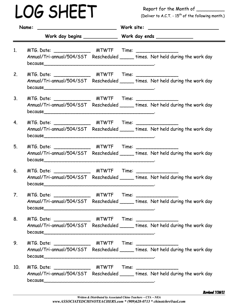 Report for the Month of (Deliver to A.C.T. 15th of the following month.) Name: Work site: Work day begins Work day ends 1. MTG. Date: MT WTF Time: Annual/Biannual/504/SST Rescheduled times. Not held